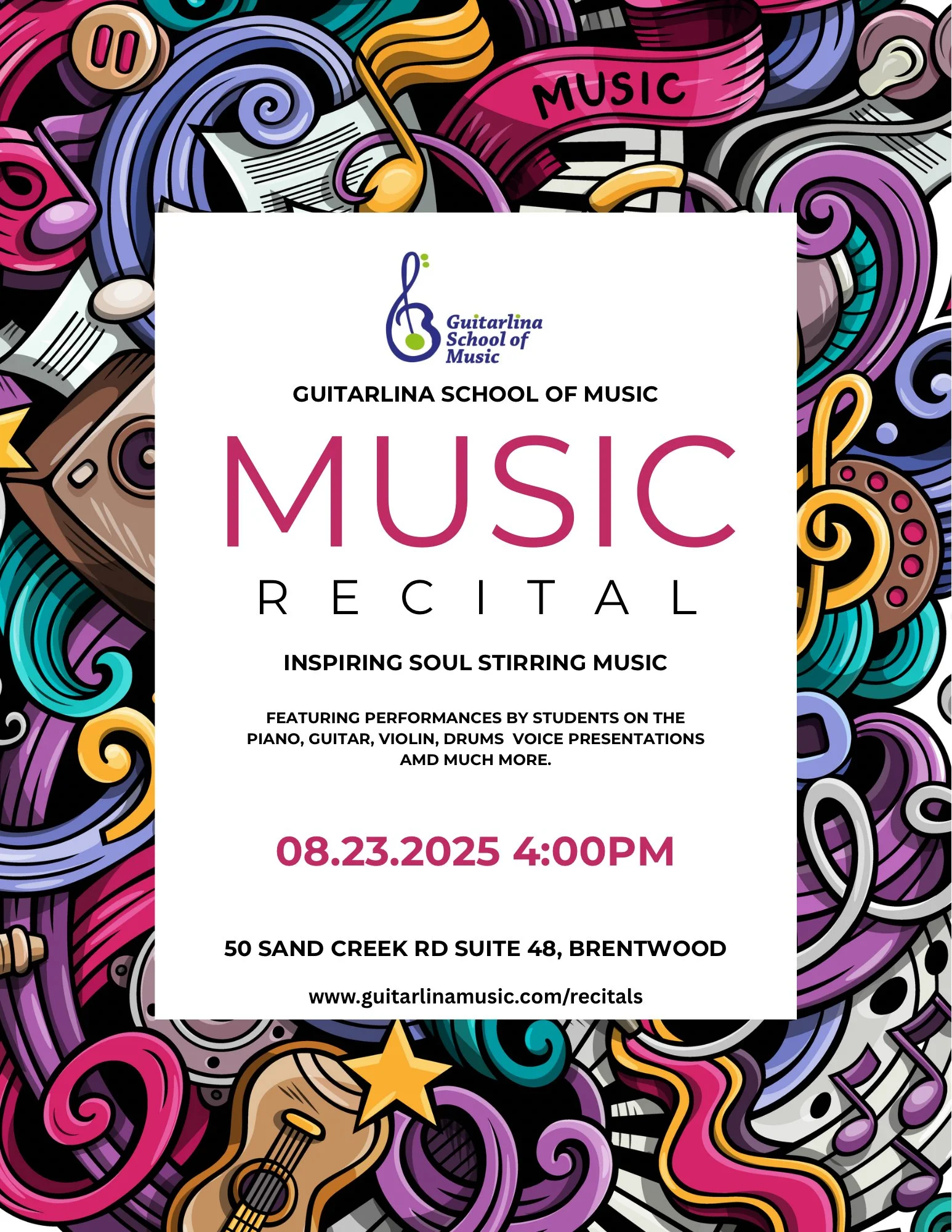 Get ready to be a part of something very special! Guitarlina School of Music is hosting another inspiring music recital, showcasing our talented and budding musicians. Come and witness a community of learners showcasing their talents on the keyboard, guitar, voice, and much more.
